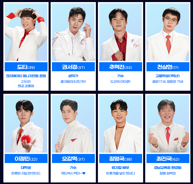 - 손빈아, 최재명, 김용빈, 춘길, 추혁진, 남승민, 홍성호, 박지후, 남궁민, 이지훈
